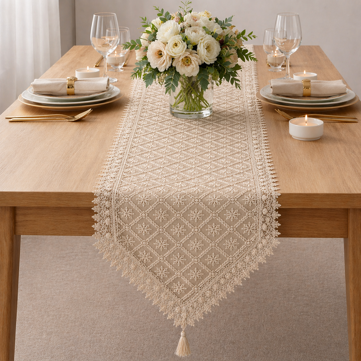 Κομψό διακοσμητικό τραπεζομάντηλο / runner με δαντελένιο τελείωμα και ιδιαίτερο κεντητό σχέδιο, ιδανικό για τραπέζι σαλονιού, τραπεζαρία, κονσόλα ή μπουφέ. Προσφέρει κλασικό και προσεγμένο αποτέλεσμα στον χώρο, ενώ ταιριάζει εύκολα τόσο σε καθημερινή όσο και σε πιο επίσημη διακόσμηση.
