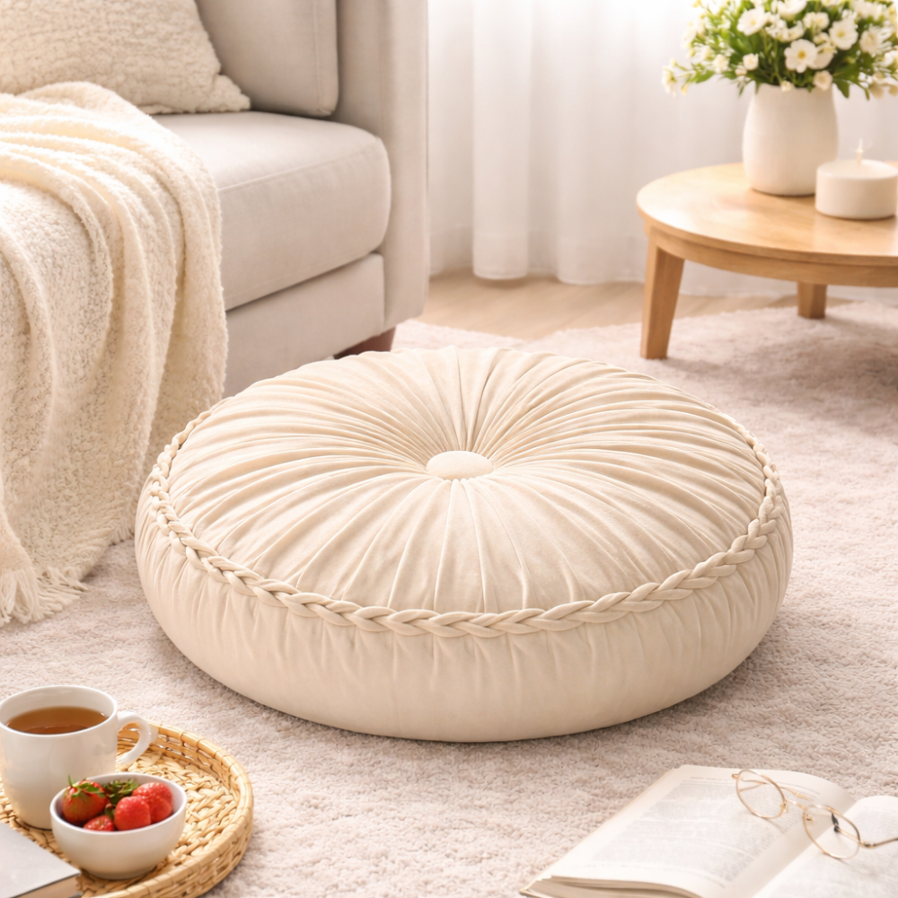 Στρογγυλό διακοσμητικό μαξιλάρι καθίσματος, ιδανικό για το σαλόνι, το υπνοδωμάτιο, τη γωνιά χαλάρωσης ή και ως βοηθητικό κάθισμα στο πάτωμα. Ο κομψός σχεδιασμός με τις πτυχώσεις και το διακοσμητικό τελείωμα δίνει ζεστή και ιδιαίτερη αισθητική στον χώρο.