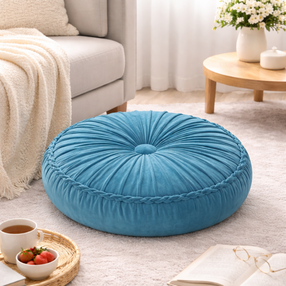 Στρογγυλό διακοσμητικό μαξιλάρι καθίσματος, ιδανικό για το σαλόνι, το υπνοδωμάτιο, τη γωνιά χαλάρωσης ή και ως βοηθητικό κάθισμα στο πάτωμα. Ο κομψός σχεδιασμός με τις πτυχώσεις και το διακοσμητικό τελείωμα δίνει ζεστή και ιδιαίτερη αισθητική στον χώρο.