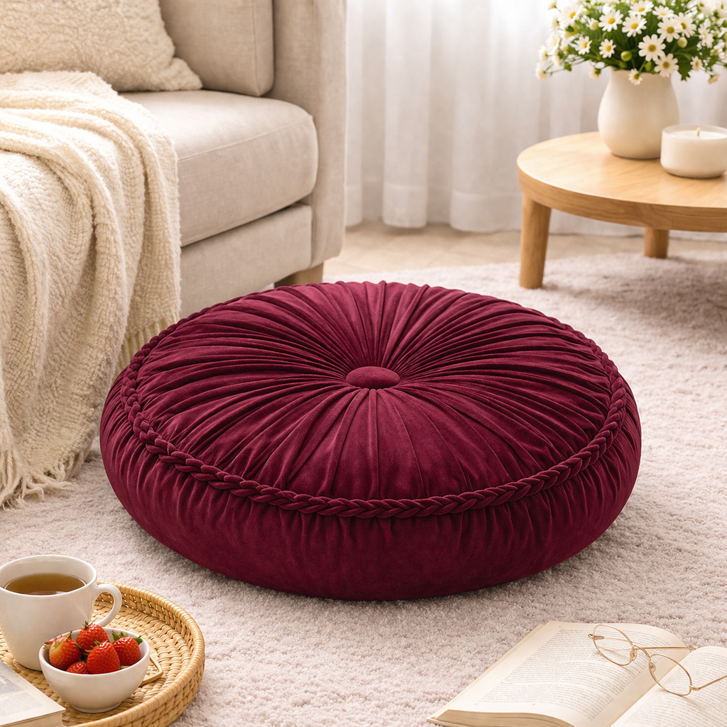 Στρογγυλό διακοσμητικό μαξιλάρι καθίσματος, ιδανικό για το σαλόνι, το υπνοδωμάτιο, τη γωνιά χαλάρωσης ή και ως βοηθητικό κάθισμα στο πάτωμα. Ο κομψός σχεδιασμός με τις πτυχώσεις και το διακοσμητικό τελείωμα δίνει ζεστή και ιδιαίτερη αισθητική στον χώρο.