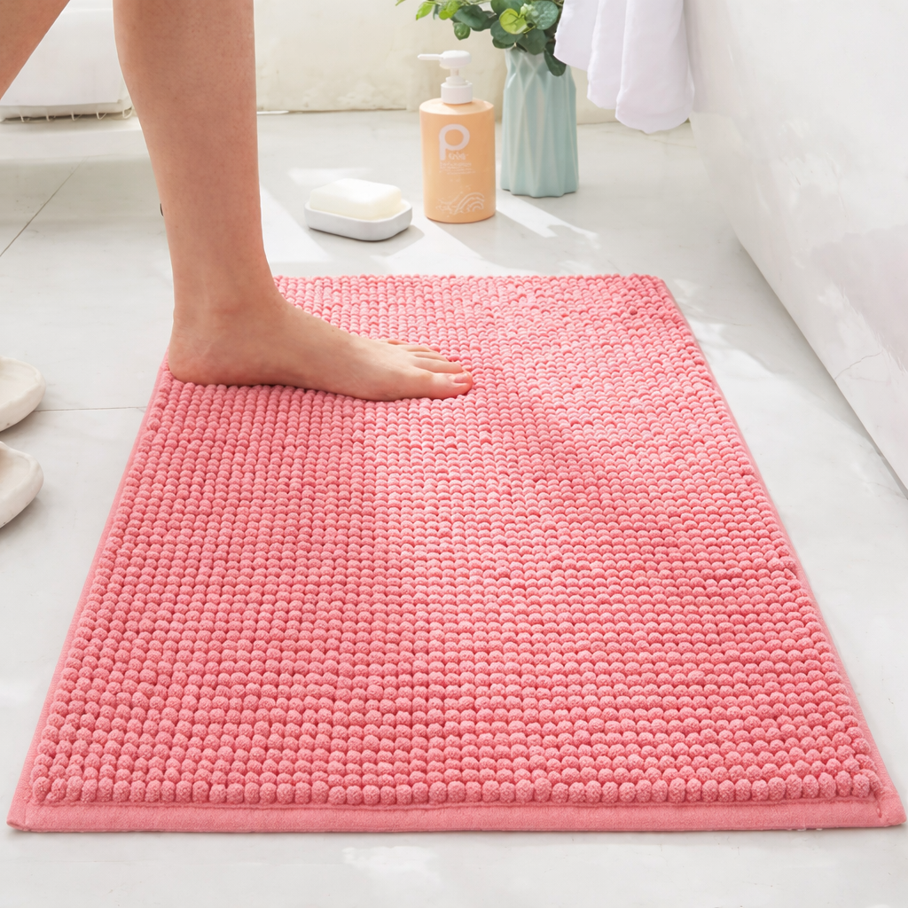 Το χαλάκι μπάνιου από κοντή σενίλ με θερμοκολλημένη αντιολισθητική βάση συνδυάζει άνεση, πρακτικότητα και αντοχή για καθημερινή χρήση. Η μαλακή επιφάνεια από σενίλ προσφέρει ευχάριστη αίσθηση στο πάτημα, ενώ η αντιολισθητική βάση βοηθά το χαλάκι να μένει πιο σταθερό στο δάπεδο. Είναι ιδανικό για μπάνιο, WC ή χώρους κοντά σε νιπτήρα και μπανιέρα, προσφέροντας πιο άνετο και προσεγμένο αποτέλεσμα στον χώρο.