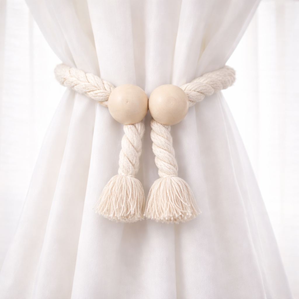 Μαγνητικό δέσιμο κουρτίνας με πλεκτό κορδόνι, ξύλινη μπίλια και διακοσμητικές φούντες. Μια πρακτική και κομψή λύση για να συγκρατείτε την κουρτίνα χωρίς τρύπημα ή πρόσθετα εξαρτήματα.Ταιριάζει εύκολα σε διαφορετικά στυλ διακόσμησης και δίνει πιο τακτοποιημένη και όμορφη εικόνα στον χώρο.